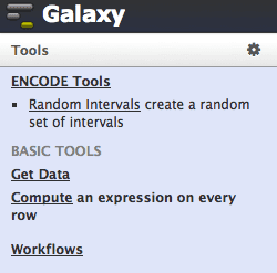 Restarting our Galaxy server produces a tool panel that looks like this. Notice that the new section named "ENCODE Tools" is displayed at the top of the tool panel since we added it to that location in our tool_conf.xml file.