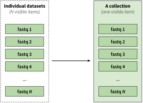 | Figure 2. A collection is any number of datasets bundled as a single entity. In this example, to, say, map N fastq files against the human genome you need to manually start N mapping jobs. Yet if you first combine individual datasets into a collection, you will only need start a mapping job once using the collection as the only input. |