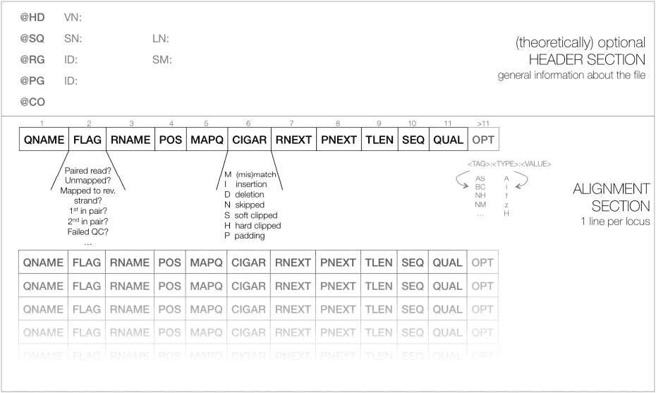 | Figure 11. Schematic representation of a SAM file. Each line of the optional header section starts with “@”, followed by the appropriate abbreviation (e.g., SQ for sequence dictionary which lists all chromosomes names (SN) and their lengths (LN)). The vast majority of lines within a SAM file typically correspond to read alignments where each read is described by the 11 mandatory entries (black font) and a variable number of optional fields (grey font; from tutorial by Friederike Dündar, Luce Skrabanek, and Paul Zumbo). |